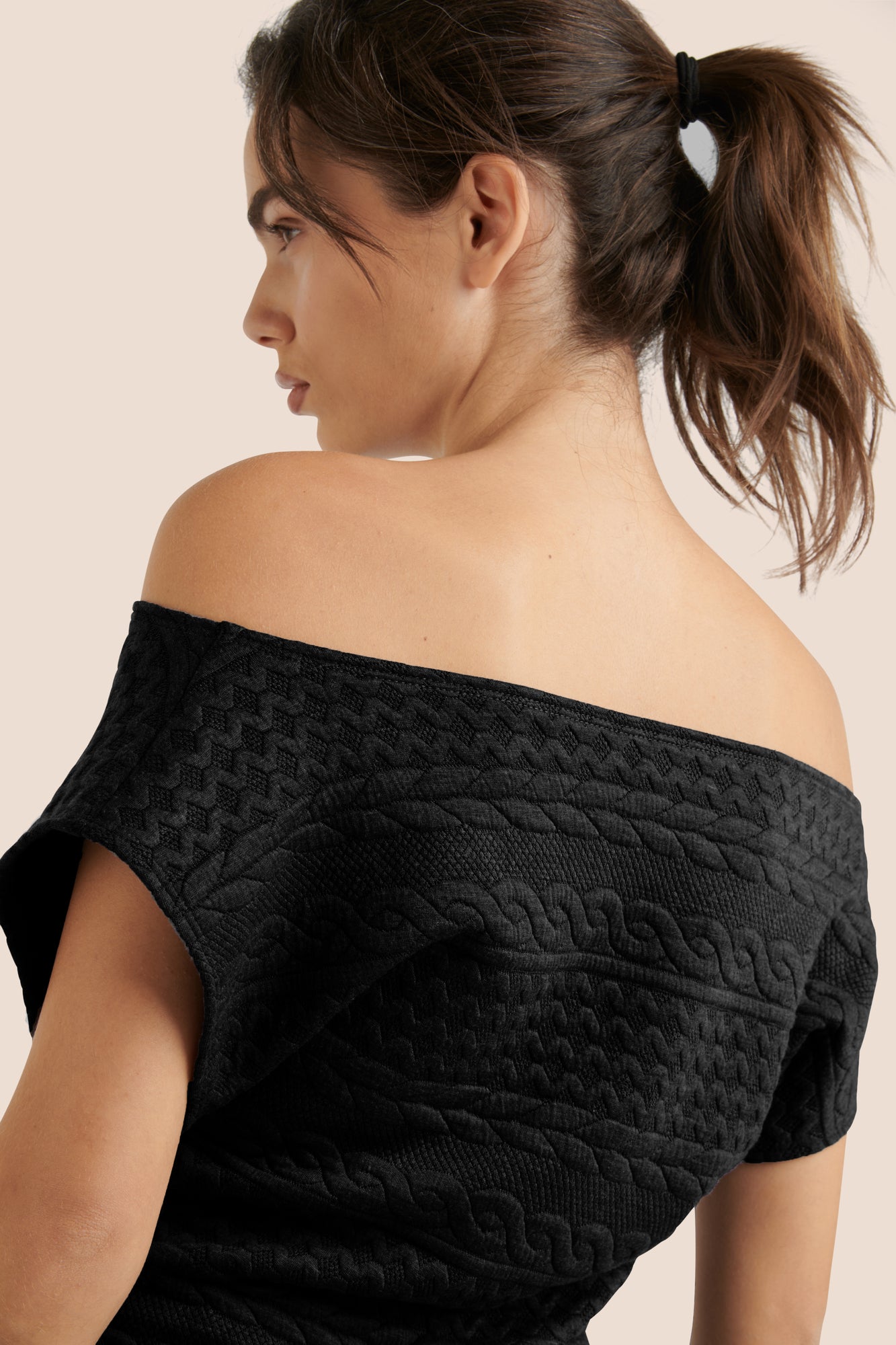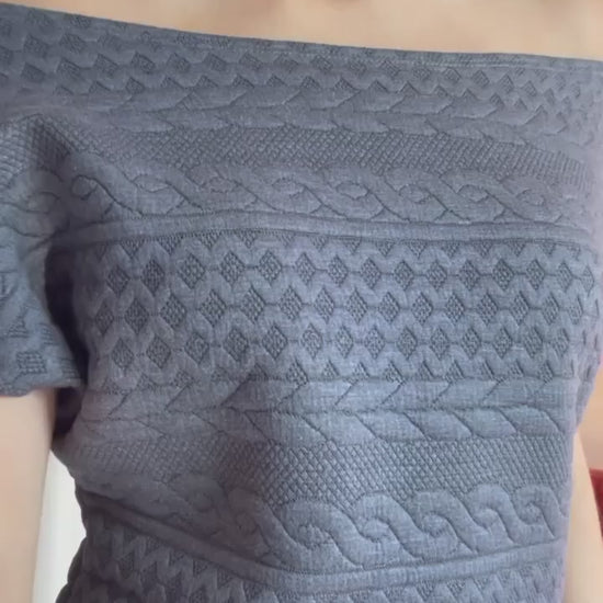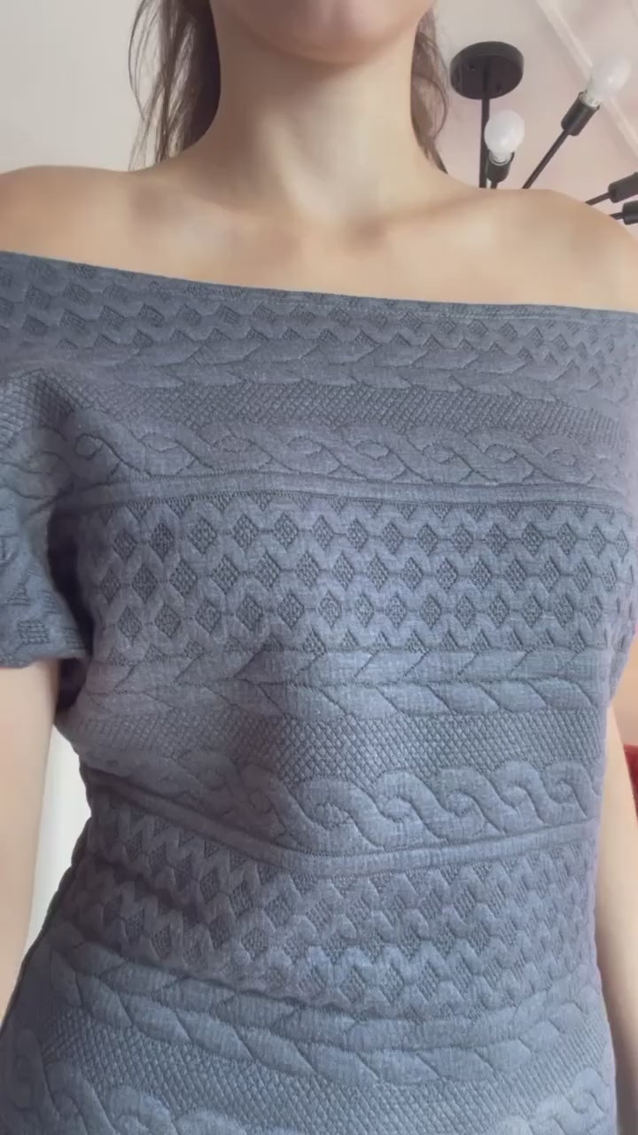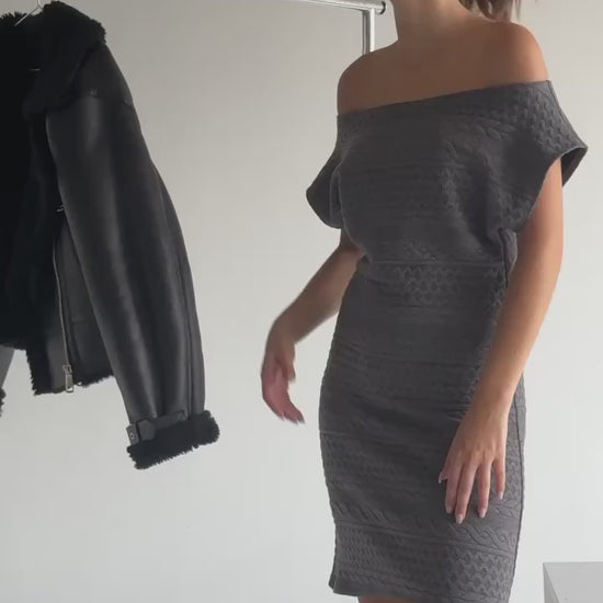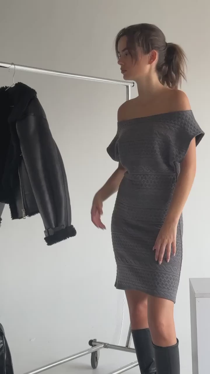 This off shoulder short dress pairs well with knee high boots and a textured winter jacket for a cute, fun and flirty winter vibe! Designed and made in Canada.