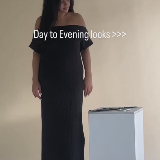 This off shoulder dress is perfect to wear from the office to dinner. Pair it with a waist belt and ankle boots and you’ll have everyone asking you where you got this Canadian made design. Can be worn as a boat neck as well.